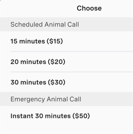 10 or 20 minute virtual animal care — pay per visit.